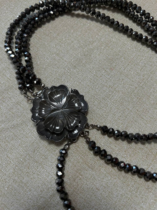 Collana a tre fili, cristalli grigio topo con susta fiore madreperla