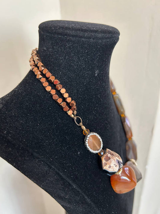 Collana girocollo con pietre dure di sfumature sul marrone, verde e nero. Inserto in ottone