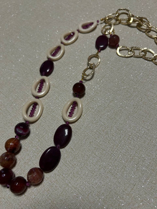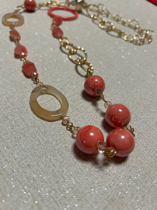 Collana rosso mattone pietre dure intervallate da cristalli con inserto di ottone
